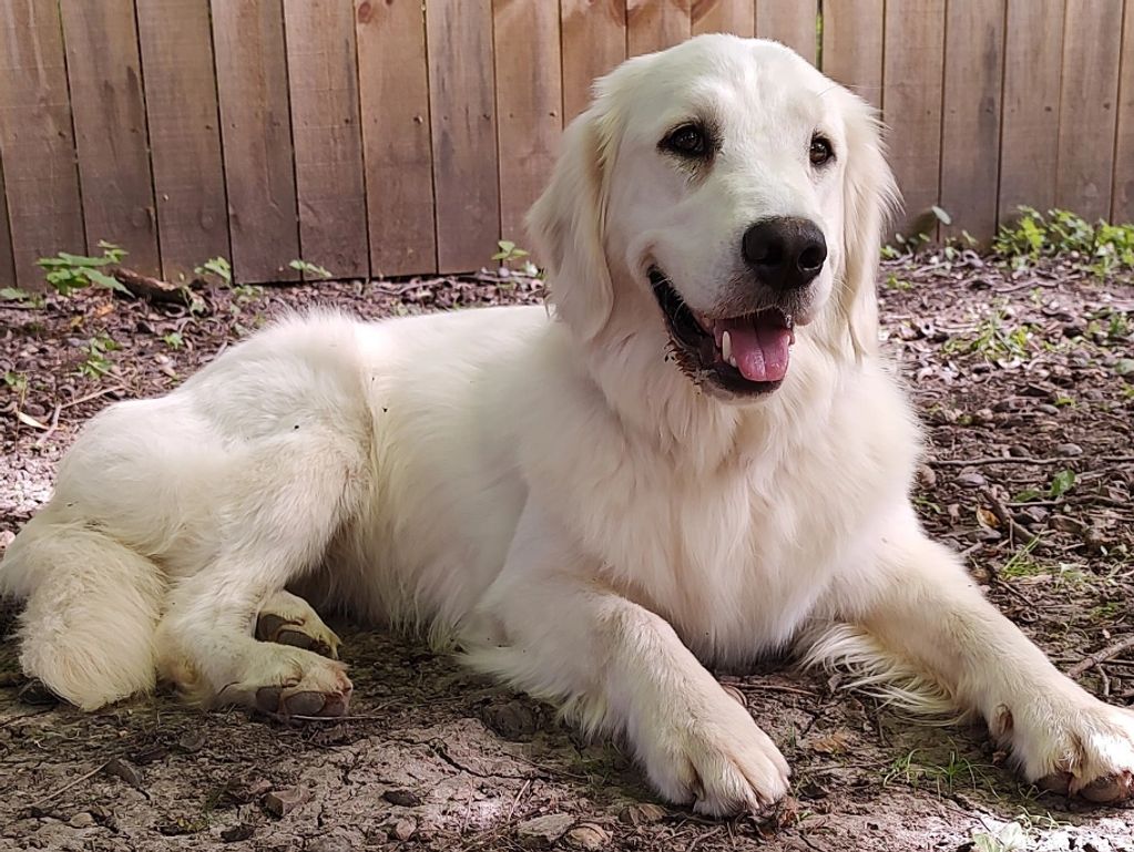 Violet is one of our biggest girls, weighing around 75 pounds. Violet much prefers spending her days outside with the boys! She LOVES to give bear hugs! We always thought she looks like a polar bear! To date, Violet has had 1 litter, absolutely gorgeous puppies with her silk coat! So far she’s not decided she wants to be mom again, which is ok! We have big hopes that she